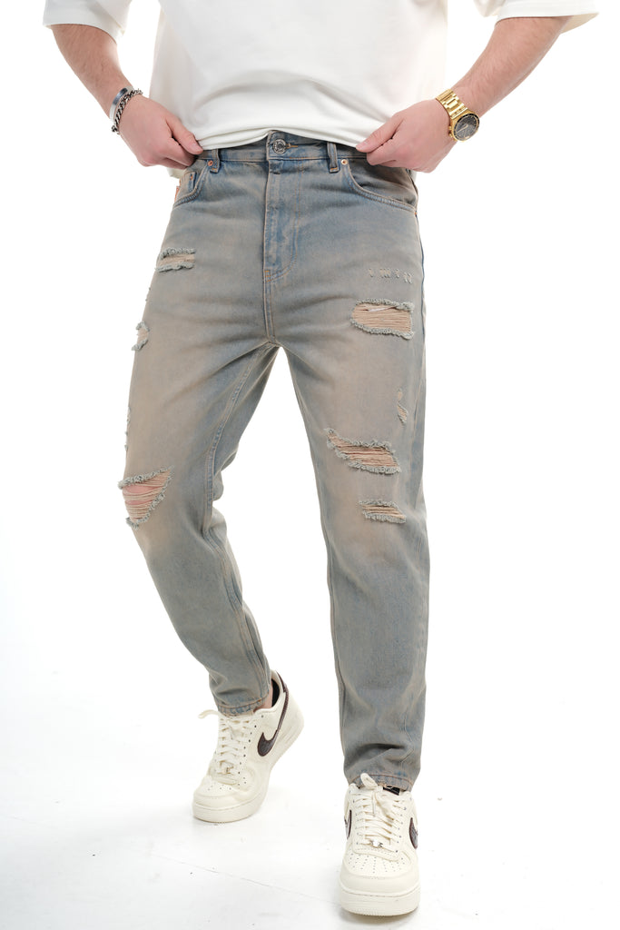 Stand out with confidence in these Men’s Distressed Light Brown Wash Denim Jeans, designed with heavy ripped detailing and a unique vintage-worn finish. These jeans offer a modern yet rugged look, blending comfort with character—perfect for anyone who likes denim with attitude.