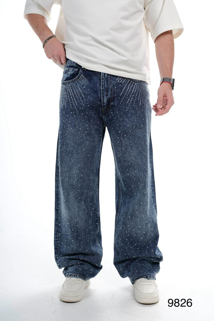 Mens Baggy Fit Rhinestone Embellished Blue Denim Jeans 0924B9826
