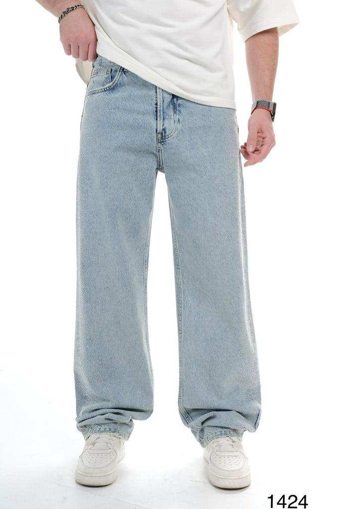 Mens Light Blue Baggy Rhinestone Detail Denim Jeans 0625C1424