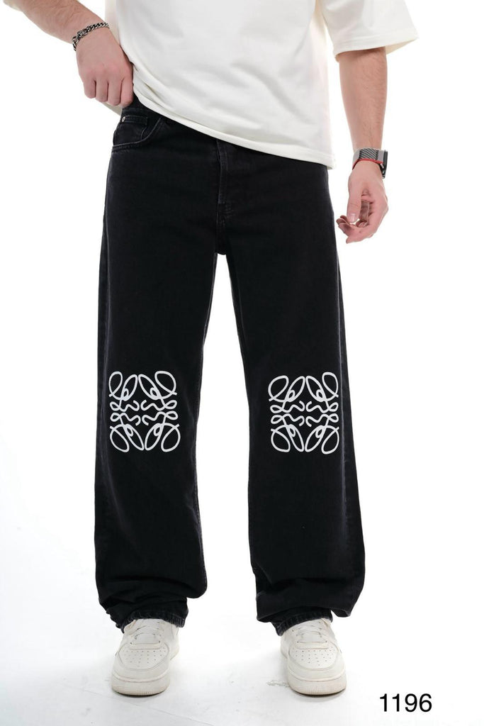 Mens Baggy Black Denim Jeans With White Graphic Knee Print 0225C1196