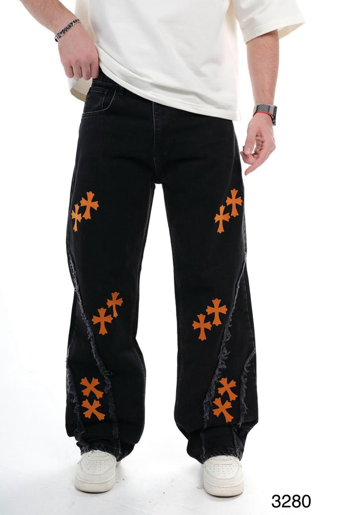 Mens Black Baggy Cross Print Patchwork Denim Jeans Streetwear Wide Leg 0325ES3280