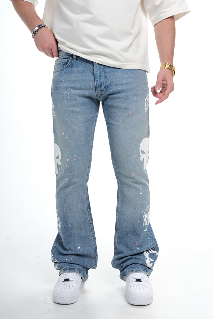 Mens Light Wash Skull Print Straight Leg Denim Jeans 1025C1537