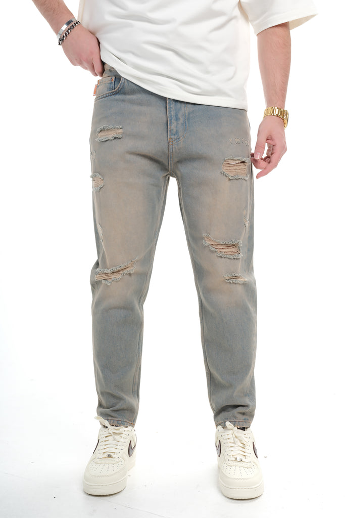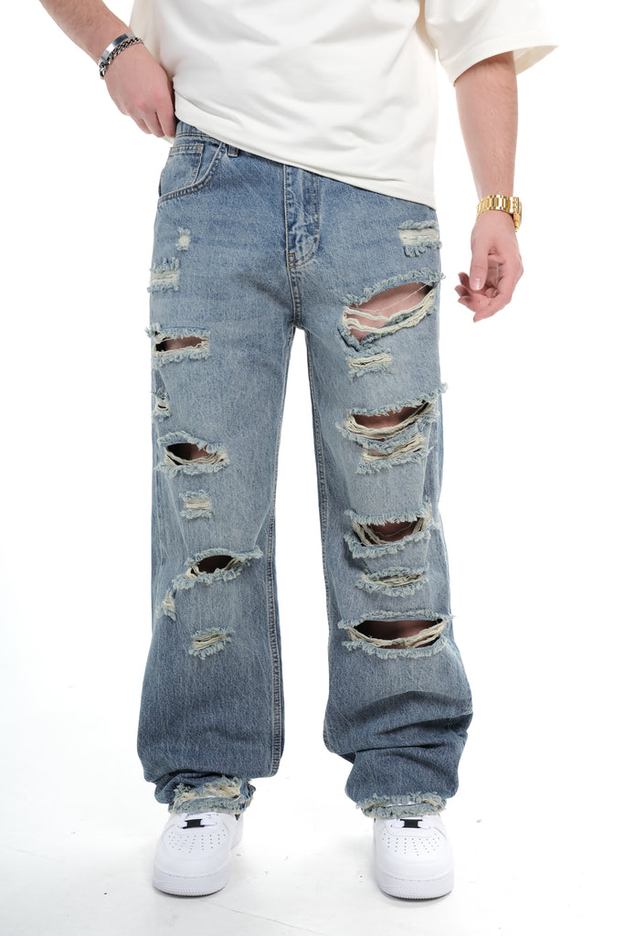 Mens Heavy Ripped Light Vintage Wash Wide Leg Jeans 0125ES3270