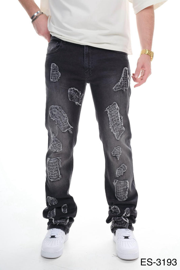 Mens Black Heavy Distressed Denim Jeans Textured Patch Details 0824ES3193