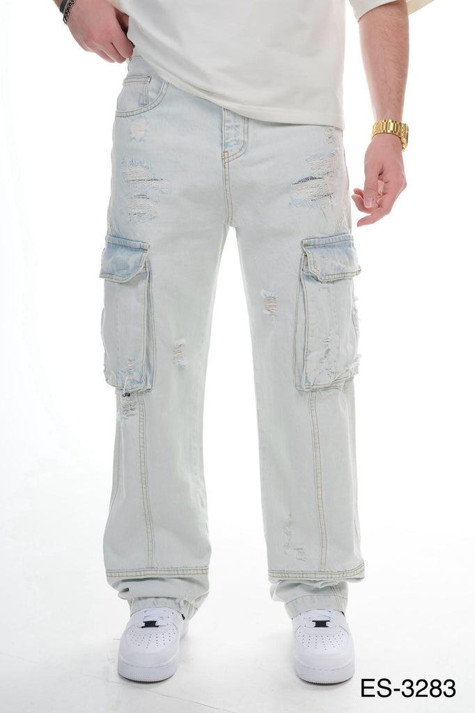 Mens Light Wash Cargo Denim Jeans Distressed Multi Pocket Wide Leg 0325ES3283
