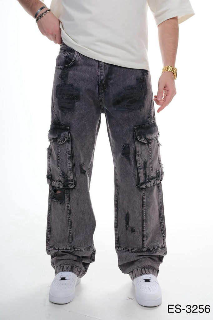 Mens Washed Black Cargo Jeans Distressed Multi Pocket Loose Fit 1224ES3256