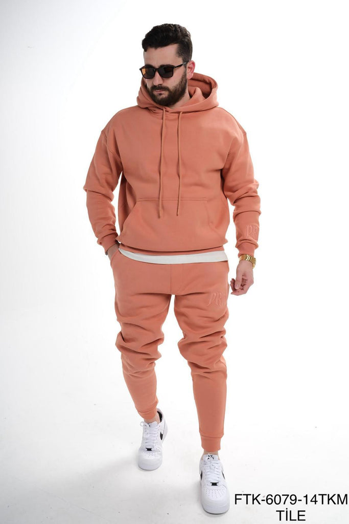 Mens Terracotta Embossed Hoodie Jogger Tracksuit Set Premium Soft